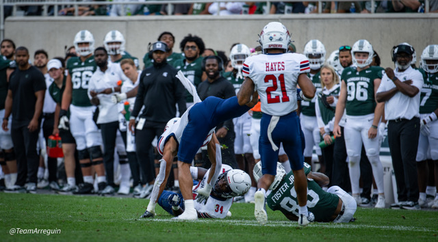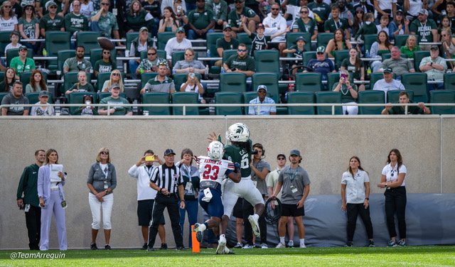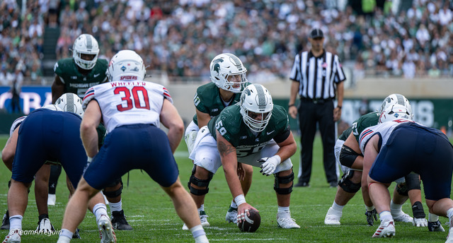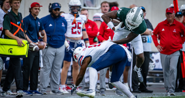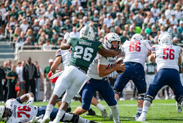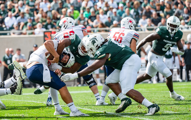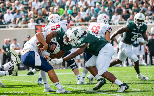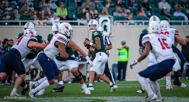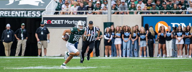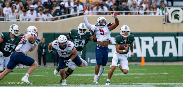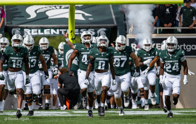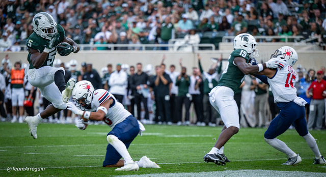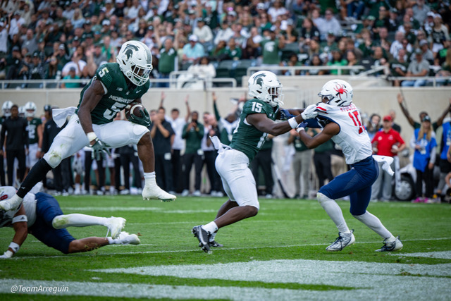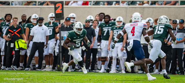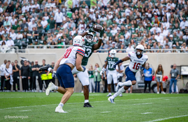 MSU Spartans racks up 465 yards on offense and wallop the visiting Richmond Spiders 45-14. Noah Kim throws for 292 yards and 3 touchdowns. While Nathan Carter rushes for 111 yards on on 19 carries and scores 3 touchdowns.