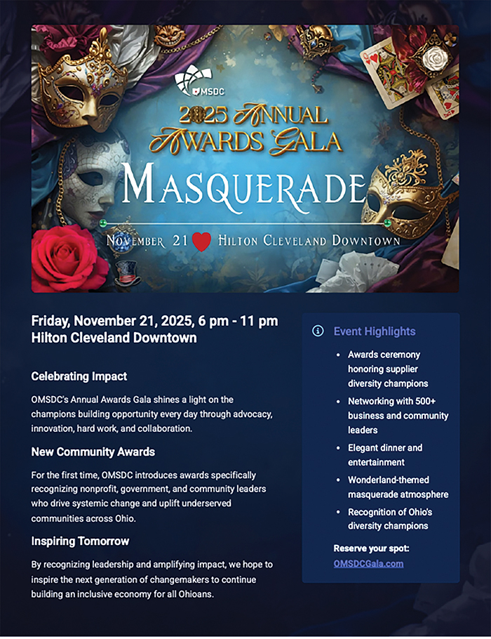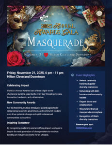 This November 21, 2025, at the Hilton Cleveland Downtown, OMSDC invite the Latino, African America, AAIP community and others to Step Into Wonderland at its Annual Awards Gala. But this year’s masquerade celebration brings something new: Community Awards that highlight the changemakers lifting neighborhoods, influencing policy, and empowering youth.