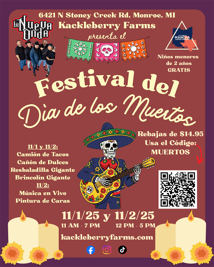 MONROE, MI, October 2025: Kackleberry Farms invites families and friends to join in a vibrant celebration of culture, remembrance, and community at its first ever Día de los Muertos Festival, taking place Saturday, November 1 (11 AM-7 PM) and Sunday, November 2 (12 PM-5 PM) at the farm in Monroe, Michigan.