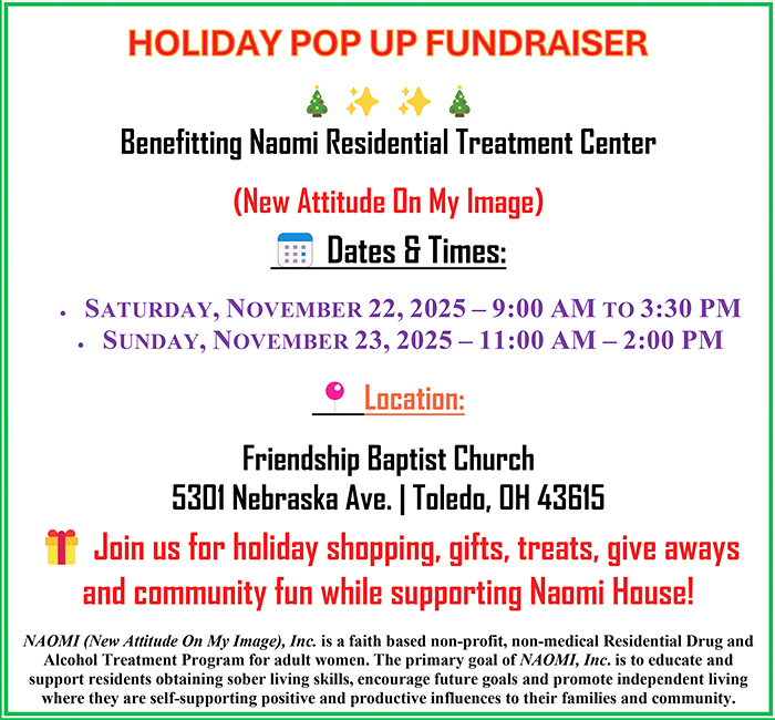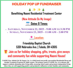 Get ready for NAOMI (New Attitude On My Image) – Christmas Pop Up Shop Fundraiser, Saturday, November 22nd, 2025: 9:00 am – 3:30 pm & Sunday November 23rd, 2025: 11:00 am-2:30 pm (Immediately following our 9:30 am morning worship service). Both days will be located at Friendship Baptist Church, 5301 Nebraska Ave, Toledo, Ohio 43615.