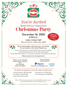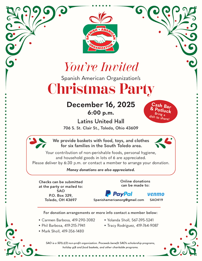The Spanish American Organization (SAO) is having its annual Christmas party this year at Latins United Hall (706 S. Clair St.) in Toledo, Ohio, on December 16, 2025, @ 6 pm. If you are looking for someplace to go, a way to give back to your community, or just to volunteer somewhere, come out to Latins United and help provide food and gift baskets filled with toys and clothes for six (6) families in South Toledo. And if you don’t have the time, please consider making a financial donation or bringing a non-perishable food item, personal hygiene products, and or household goods to a SAO board member. This event will also have a cash bar and potluck, so bring your favorite dish to share with all the other donors and volunteers and come out and have a good time.