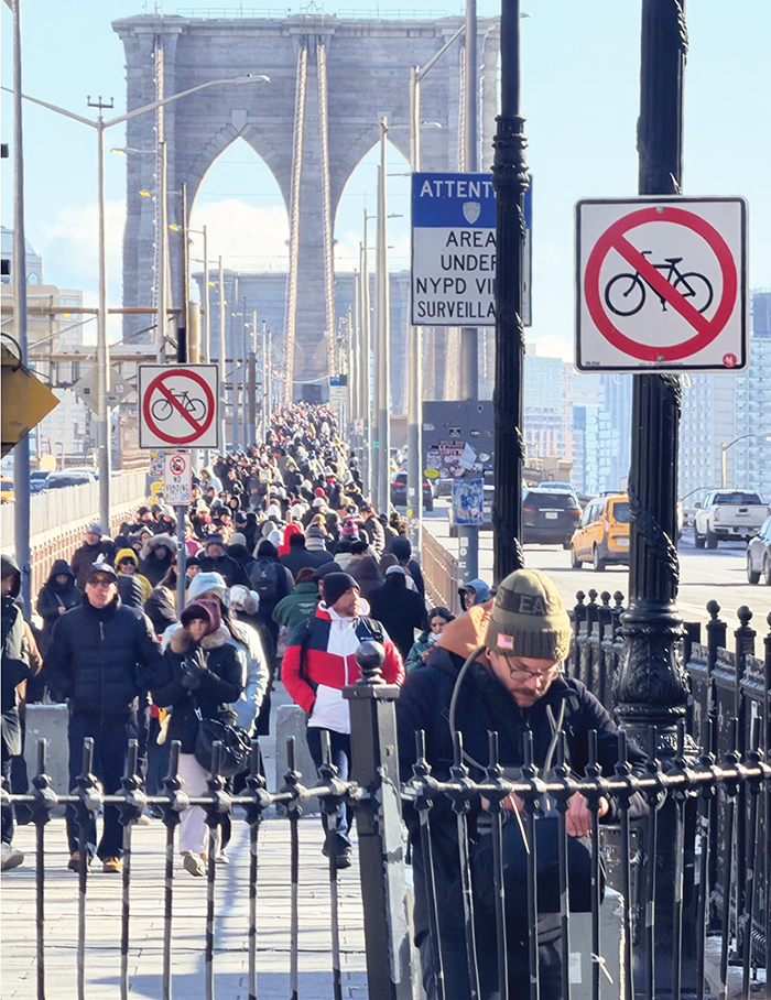 Esta es una nueva era para la Ciudad de Nueva York (NYC), y La Prensa, Inc. estuvo allí para este momento histórico. El jueves 1 de enero de 2026, frente al City Hall, a la 1 pm, el recién elegido alcalde Zohran Mamdani (D) invitó al público a su inauguración. El día era frío, como es Nueva York durante el invierno, pero la energía y la cantidad de personas presentes en este momento histórico fueron realmente asombrosas y transformadoras para muchas personas de grupos históricamente marginados. Esta ceremonia pública y gratuita contó con una fila de personas que se extendía a lo largo de varias manzanas de Nueva York, y una fiesta callejera, también gratuita y abierta al público, que abarcaba varias manzanas y parecía tan larga como las filas para ver la caída de la bola de Nochevieja la noche anterior. Todos estaban de buen humor, admirando a las celebridades y gritando “Te queremos, Bernie” cuando el senador Bernie Sanders entró. Desde Brooklyn hasta Nueva York, cientos de personas, caminando una al lado de la otra, como una ola interminable de gente, cruzando el Puente de Brooklyn que conduce directamente al Ayuntamiento de Nueva York (ver foto). Mamdani, de 34 años, es el primer musulmán/asiático-americano y miembro del Partido Demócrata/Socialistas Democráticos de América en ser elegido alcalde de la Ciudad de Nueva York.