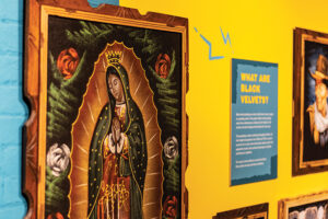 “This exhibit includes a lot of unique design and fabrication,” said Reese. “This is the first time the museum has provided bilingual labels for all content. Each label is written in both English and Spanish. For any unframed velvets, our carpenters crafted frames that match the look of traditional black velvet frames.”