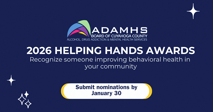 Do you know an individual making a difference in the lives of people living with mental illness or substance use disorder? Nominations are still open for the ADAMHS Board of Cuyahoga County’s 2026 Helping Hands Awards. Each award honors people who have made a meaningful impact on behavioral health in our community over the past year.