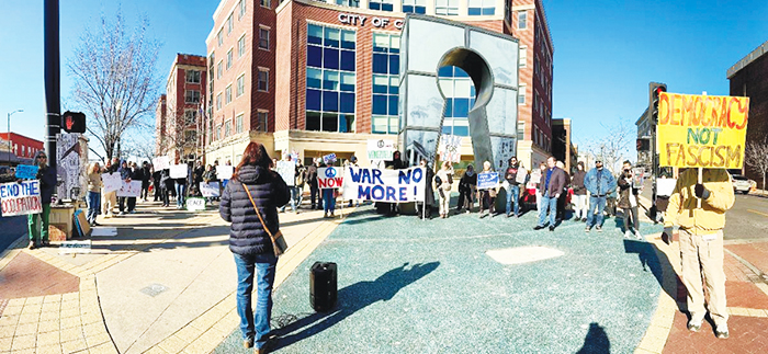 Mid-Missouri FOR and Mid-Missouri Peaceworks opposing the U.S. invasion of Venezuela at what will be a weekly Sunday demonstration at Colombia City Hall. Photo courtesy of Laura Whacker.