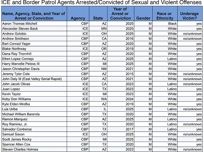 Pacific Antifascist Research Collective released a list of 29 individuals with egregious criminal records, and none of them are immigrants arrested by the federal government. They are all ICE and Border Patrol agents. The agents’ arrests and, in many cases, convictions, span a period of 10 years, from 2015-2025, but 11 of the 29 (38%) are from 2025, a marked uptick in abusive agents.
