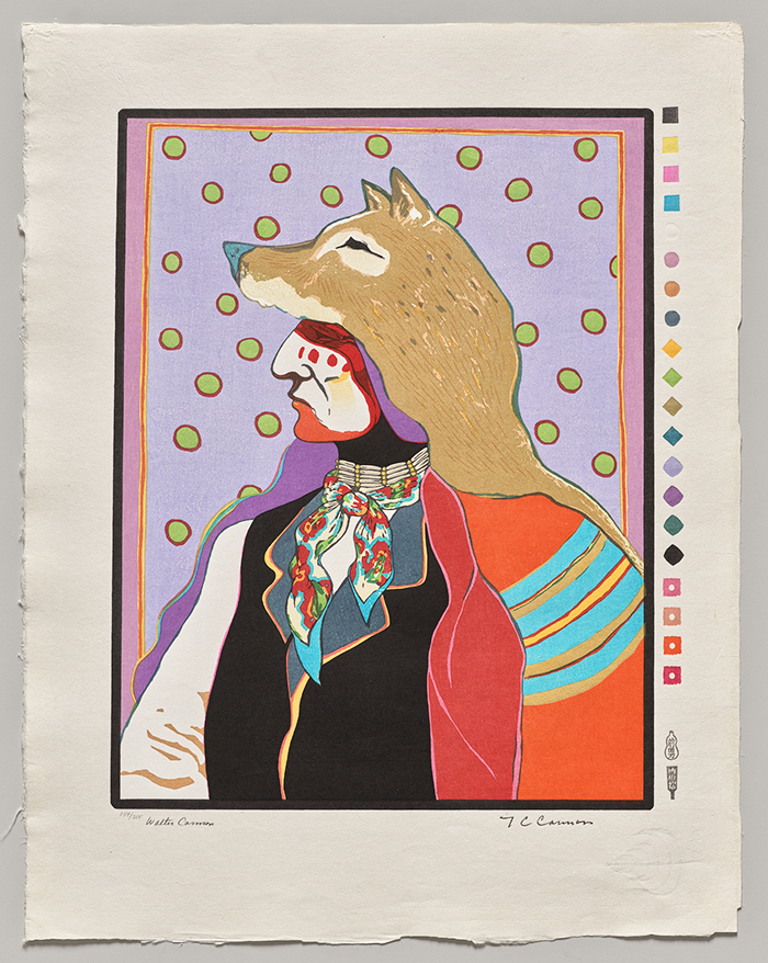 The objects on view survey the ways in which Native artists have innovatively used various print and drawing techniques to explore their cultural heritage. Notable works in the collection range from a series of powerful woodcut portraits by T. C. Cannon (Kiowa-Caddo, 1946–1978) to a set of deeply symbolic color lithographs by Jaune Quick-to-See Smith (Citizen of the Confederated Salish and Kootenai Nation, 1940–2025). The presentation also includes work by multimedia artists, such as Wendy Red Star (Apsáalooke/Crow, b. 1981), Kay WalkingStick (American, Member of the Cherokee Nation / Oklahoma, b. 1935), Nicholas Galanin (Tlingít/Unangax̂, b. 1979), Edgar Heap of Birds (Cheyenne and Arapaho Nations, b. 1954), and Rose B. Simpson (Santa Clara Pueblo, b. 1983), among others, to shed new light on the importance of the graphic arts within their contemporary practices.