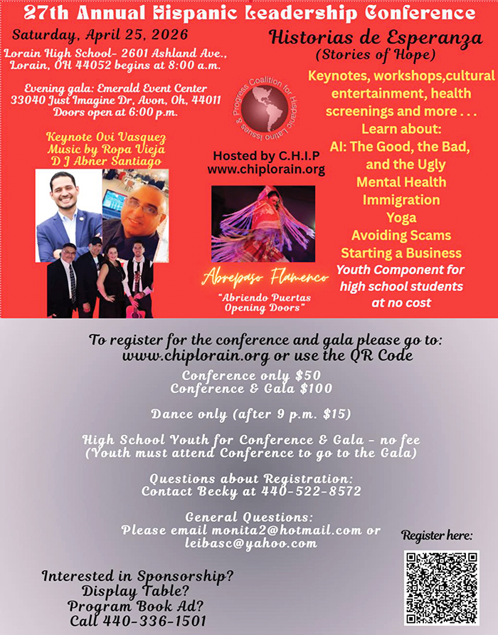 The Coalition for Hispanic/Latino Issues and Progress (CHIP) invites the community to attend the 27th Hispanic Leadership Conference, a day filled with inspiring speakers, engaging workshops, and valuable networking opportunities. This year’s conference will be held on Saturday, April 25, 2026 at Lorain High School, 2600 Ashland Ave., Lorain, OH, from 8:00 AM to 3:00 PM.